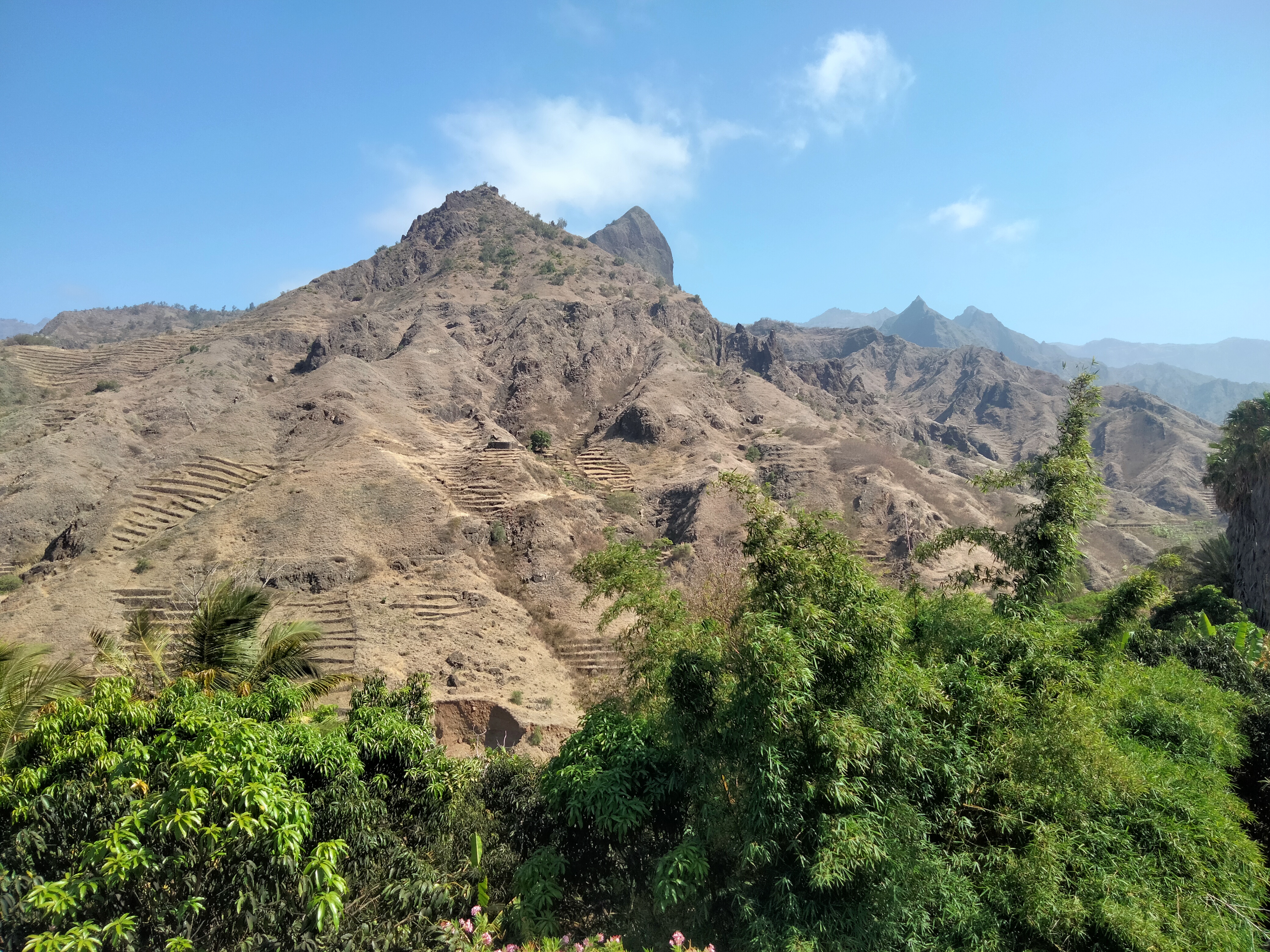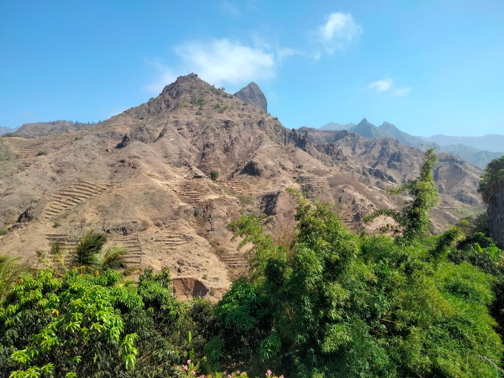 Changement total d’atmosphère et changement d’avis radical ! Après une heure de ferry depuis Sao Vicente, je découvre Santo Antao. Paradis des randonneurs, l’île offre deux visages : une haute chaîne de montagne sépare le sud aride du nord luxuriant. Dans ces vallées verdoyantes dont on ne croirait pas à l’existence avant de s’y plonger, poussent la banane, le manioc, la canne-à-sucre, l’igname, le café… On y produit un excellent rhum, appelé localement grogue, et qui donne rapidement un bon coup derrière la tête… Les options de randonnée sont multiples : sur la côté rocheuse, ou entre les villages à flanc de montagne, traversant ruisseaux et terrasses cultivées.